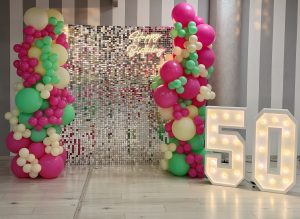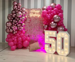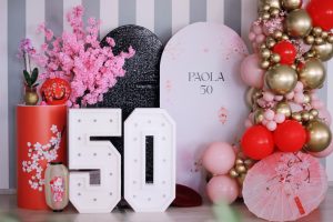 ALLESTIMENTO 50 ANNI COLORI FUCSIA E SHINY PINK 50 ANNI A TUTTO ROSA PER ROMINA Per Romina ecco una festa di 50 anni elegante e