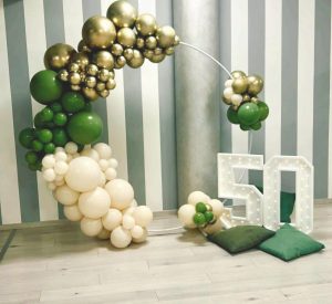 ALLESTIMENTO CERCHIO 50 ANNI COLORI PANNA oro e VERDE I PRIMI 50 ANNI DI RAFFAELLA Raffaella per i suoi 50 anni ha scelto dei colori