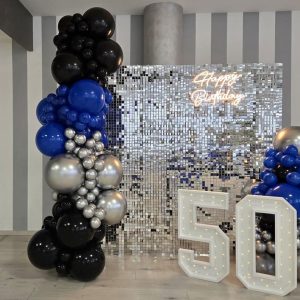 ALLESTIMENTO FESTA 50 ANNI UOMO ARGENTO E BLU I PRIMI 50 ANNI DI GIANLUCA Per questo cinquantesimo compleanno a sorpresa, l’allestimento si sviluppa attorno a