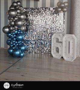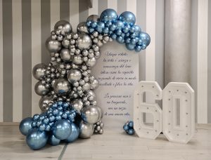 ALLESTIMENTO 60 ANNI COLORI ARGENTO E SHINY BLU tante emozioni per nando L’allestimento di Nando racconta una doppia celebrazione speciale, un sessantesimo compleanno che si