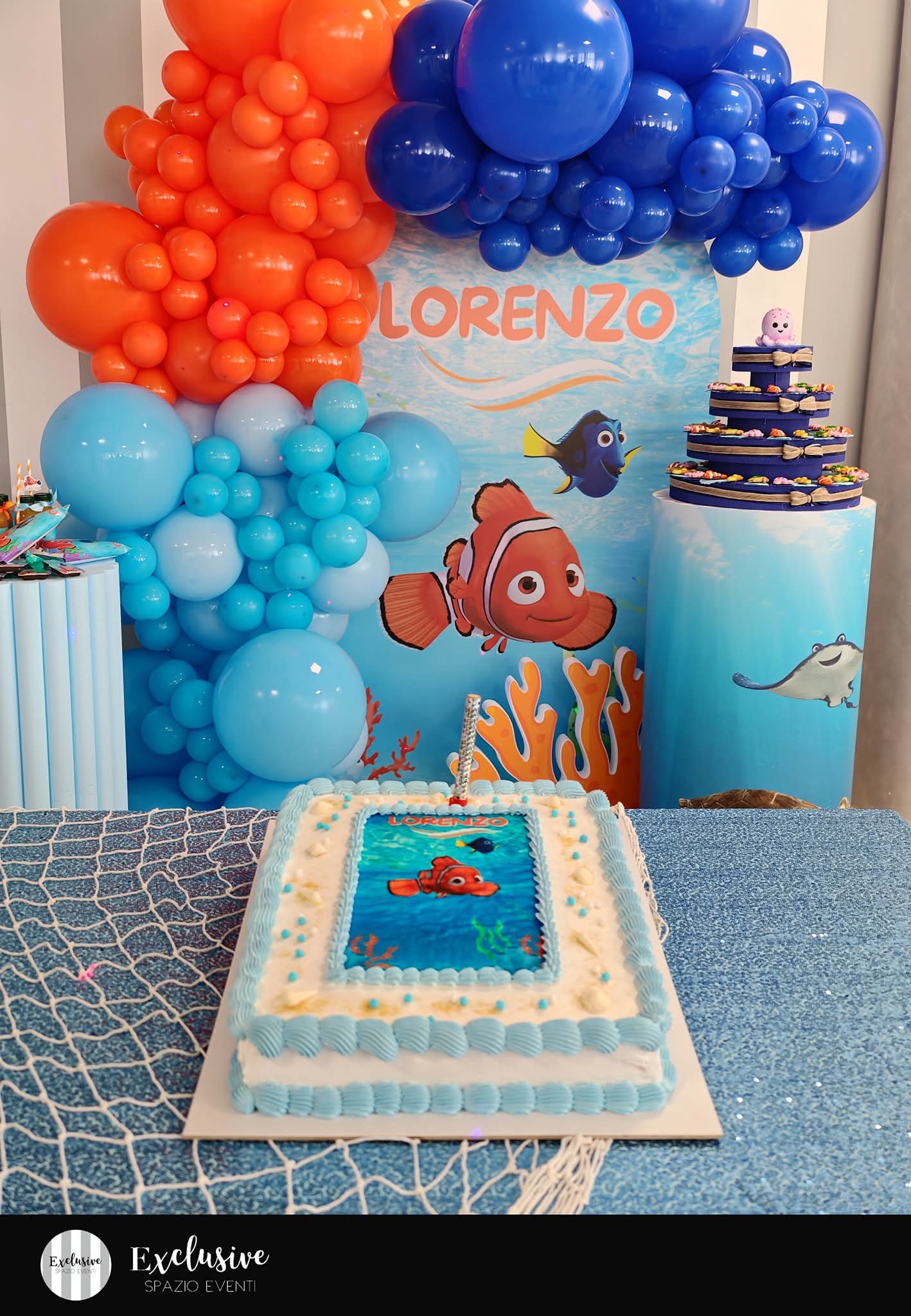 Una scelta coloratissima per questo bimbo così allegro. tutto l’allestimento con le sagome richiama il cartone del buffo pesciolino Nemo e dei suoi amici Dory, Mr Ray e Scorza.